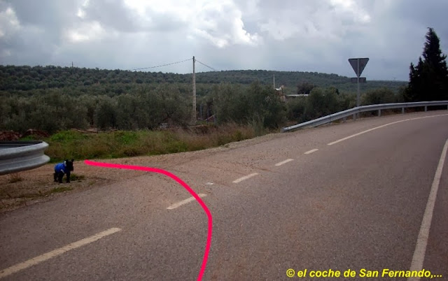 Unos metros más adelante, el camino de San Miguel fue asfaltado para dar acceso a la ronda norte, por él debemos regresar a Linares siendo harto peligroso transitar por aquí al no haberse dejado un arcén lo suficientemente ancho para peatones y habida cuenta que por aquí transitaba un PR. Por ello, planteo una alternativa que no desmerece al viejo camino de San Miguel y dará mayor seguridad al caminante. Para ello al pasar bajo la ronda norte, continuaremos por un carril olivarero que se separa a la izquierda, lo seguiremos unos doscientos metros y estaremos en el camino negro, un camino antíguo minero llamado así por los restos de escoria de la fundición San Luís que le dan un aspecto ennegrecido a la tierra ya que por aquí se llegaba esa explotación.